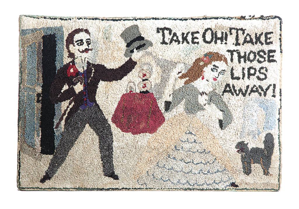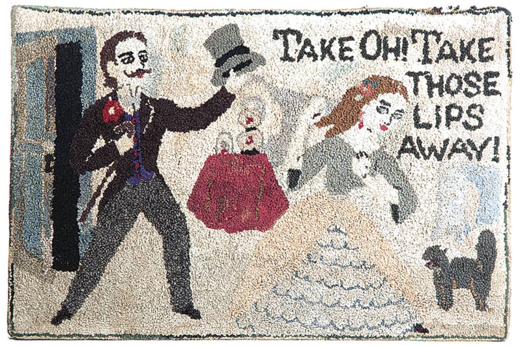 Hutchinson rugs designed in the 1920s to 1940s are desirable. They often have funny pictures and sayings. A rug showing a man chasing a woman that reads “Take, oh! Take Those Lips Away!” sold at Garth’s Auctioneers for $1,560.