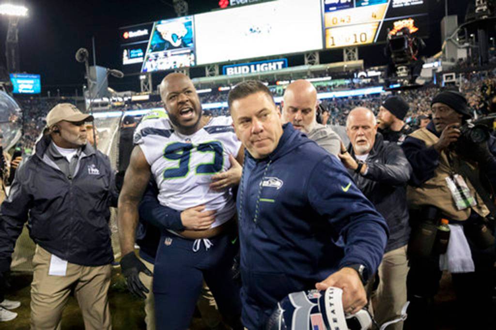 The disqualified Jefferson went to the Seahawks’ sideline instead of directly into the tunnel. Jaguars fans behind Seattle’s bench began yelling at Jefferson. More than one Seahawk said Jefferson was the target of racial slurs. At least one fan threw a beer on the big defensive tackle. That set Jefferson off. He bulled through a stadium security man and got to the padding of the lower deck of seats, then tried to scale it to the railing to go into the stands. A Seahawks staffer pulled him down. More drinks flew at him.
