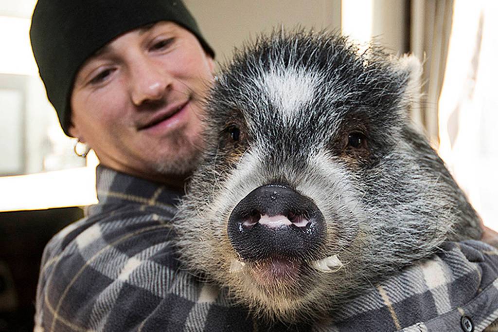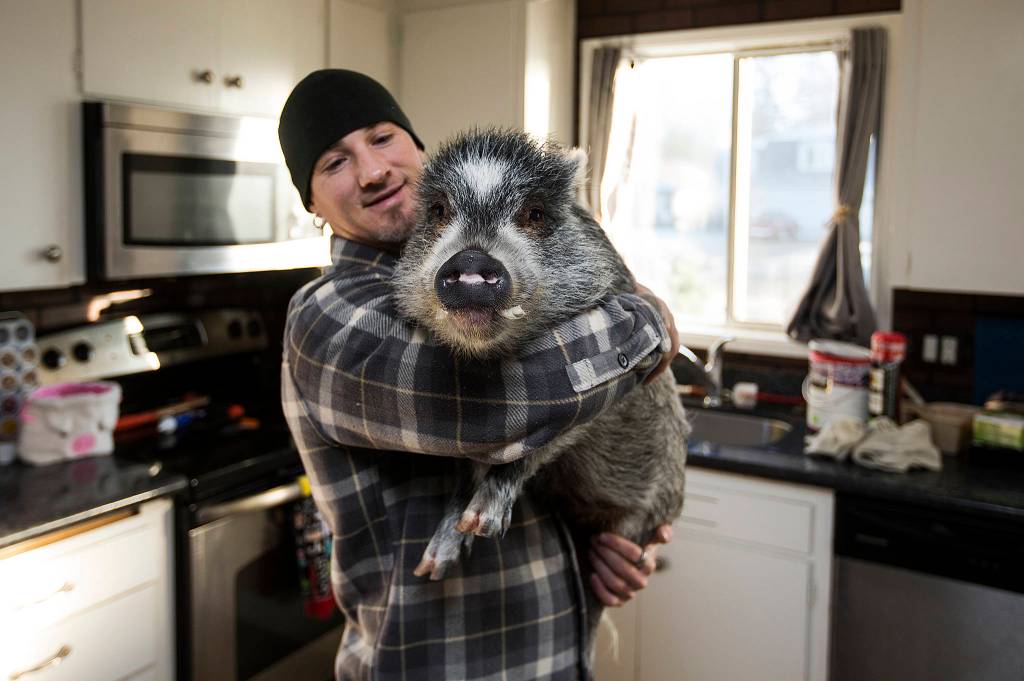 Brett Banks picks up Norman, one of three pigs he owns, at home on Dec. 7 in Everett. (Andy Bronson / The Herald)