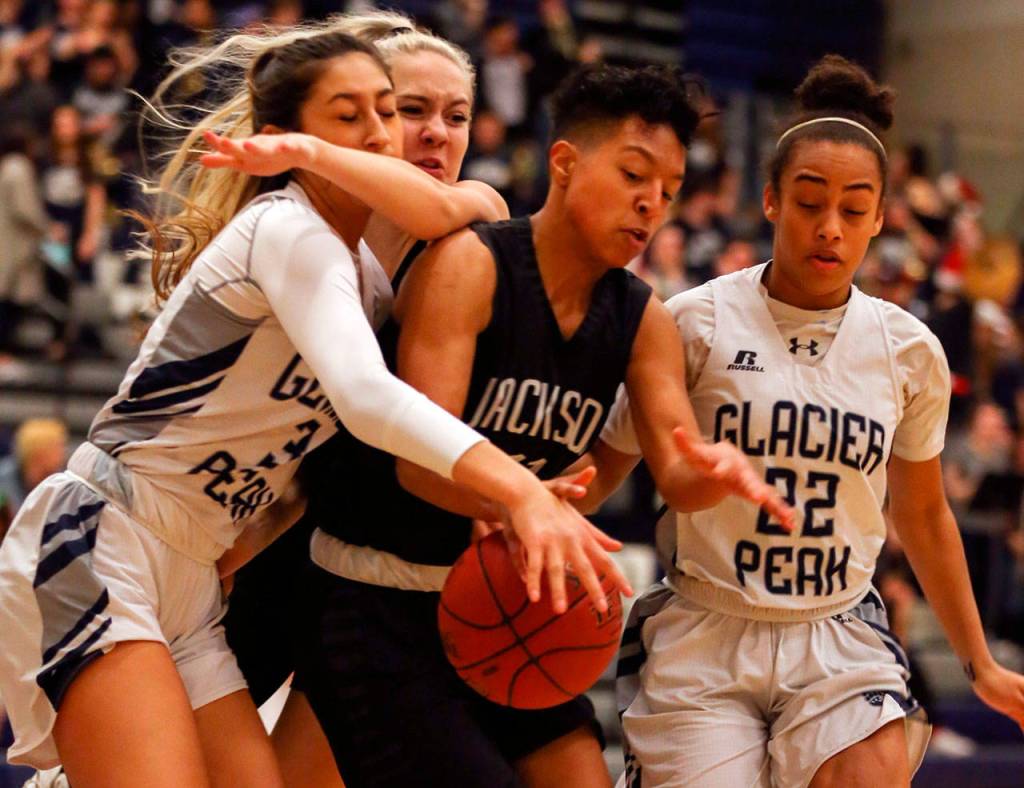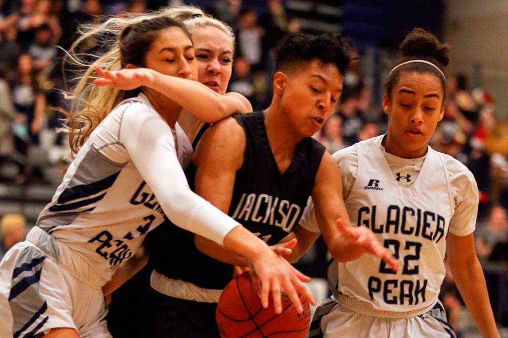 From left, Glacier Peak’s Makayla Guerra, Jackson’s Lauren Schillberg, Jackson’s Breonna Williams and Glacier Peak’s Aaliyah Collins vie for a loose ball Friday in Snohomish. (Kevin Clark / The Daily Herald)