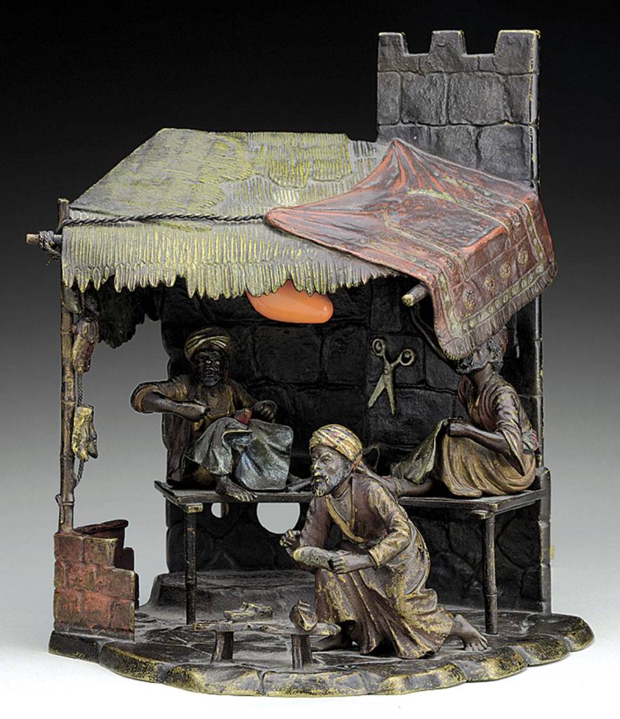 Nam Greb was an artist who made detailed, colorful cold painted bronze figures in Austria during the early 19th century. Some of his work was easy to identify. He favored tabletop scenes of Oriental life with colorful tents, figures in Arab garb, market stalls and animals. Some were even small lamps. But some figures of men had cloaks that opened to show erotic scenes or women who, when the doors opened, were naked.