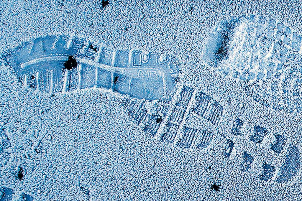 Human shoe tracks on the frosty sidewalk of a Mukilteo bridge over Merrill and Ring Creek on Dec. 11 are pointing south. (Dan Bates / The Herald)