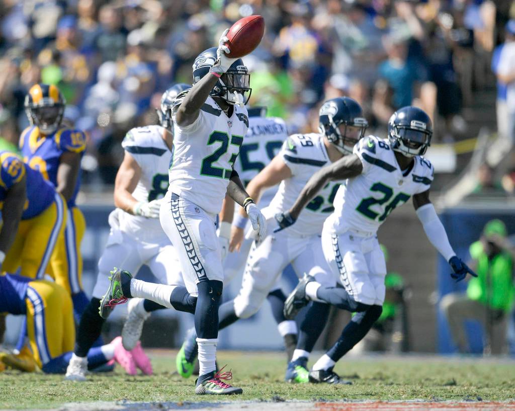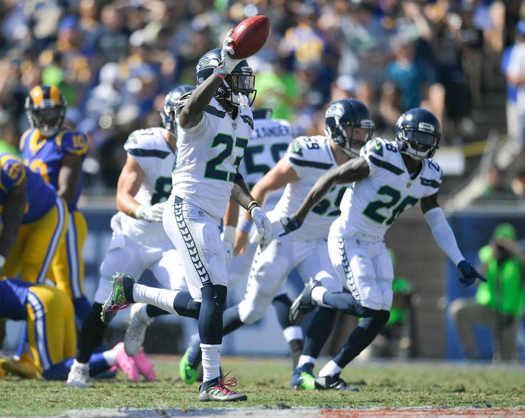 The Seahawks’ Neiko Thorpe celebrates after a turnover during a game against the Rams on Oct. 8, 2017, in Los Angeles. (AP Photo/Mark J. Terrill)
