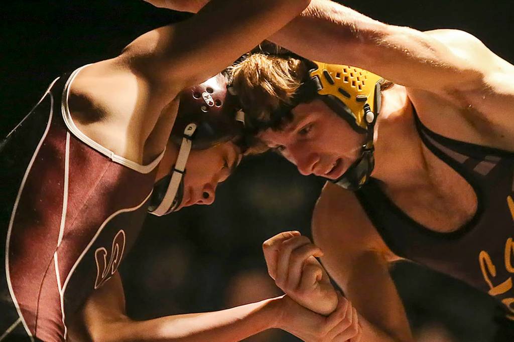 South Kitsap’s Devon Gentz and Kyle LaCoursiere of Lake Stevens work for an advantage at Lake Stevens High School on Dec. 21. (Kevin Clark / The Daily Herald)