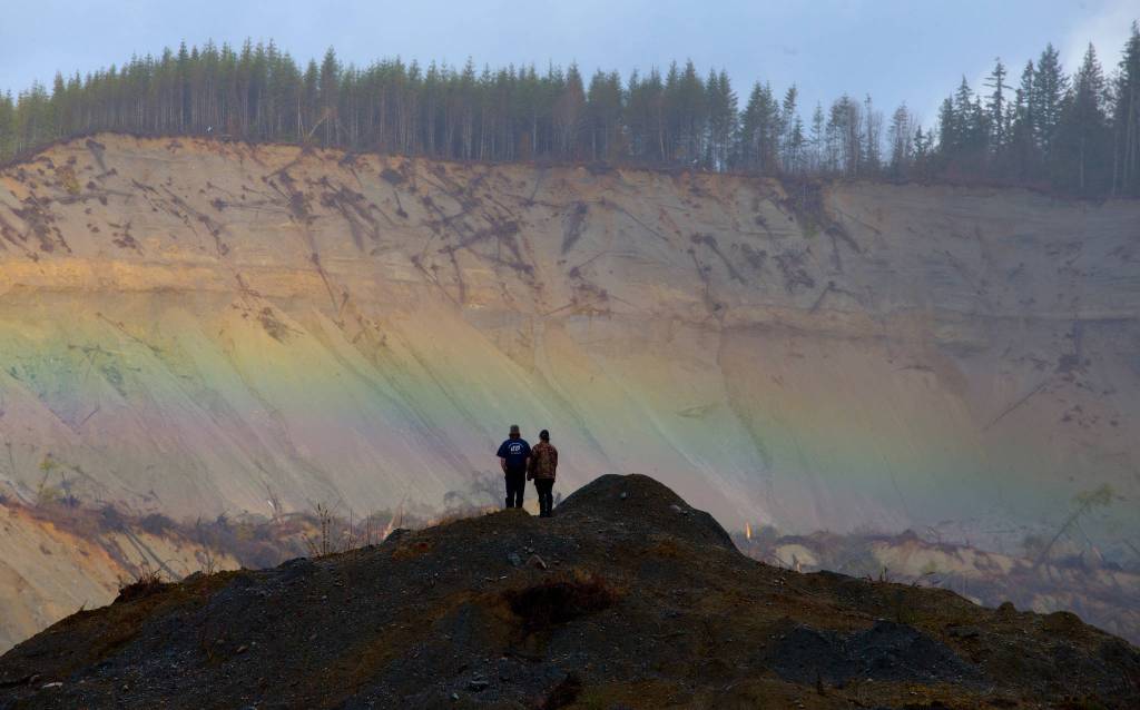 A rainbow appears in front of Andy Huestis and his girlfriend, Alisha Garvin, as they and other families gather to remember the victims on the third anniversary of the Oso mudslide on March 22 in Oso. Huestis’ sister, Christina Jefferds, died in the mudslide. (Andy Bronson / The Herald)