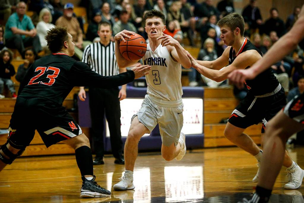 Kamiak’s hot shooting got the Knights off to a fast start Tuesday. Seven first-half 3s, coupled with stingy defense, helped Kamiak build a 32-18 halftime edge.