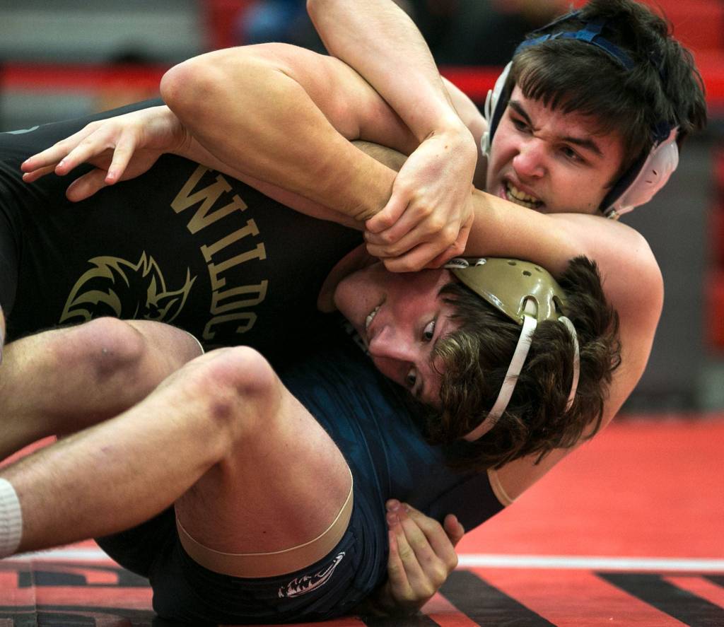 Oak Harbor’s Blake McBride, left, wrestles Arlington’s Gavin Howell during the Panther Classic at Snohomish High School Saturday night in Snohomish on January 6, 2018. McBride won the wt:145 championship. (Kevin Clark / The Daily Herald)