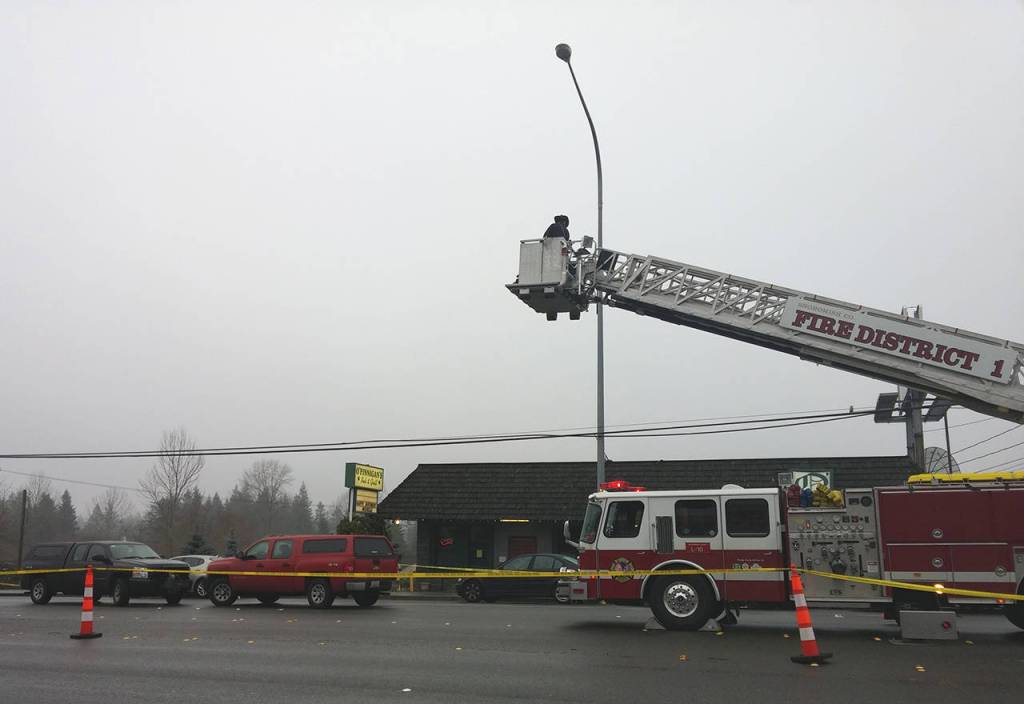 Later Saturday, police had northbound Highway 99 closed for several blocks around the scene. A fire department crew was using a ladder truck to hoist up investigators to get an aerial view. Yellow tape blocked off the bar’s parking lot, along with several vehicles that had been parked along the highway.