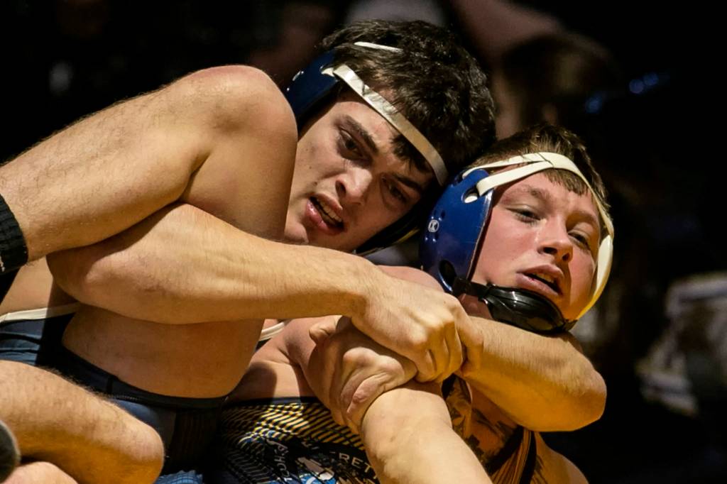 Arlington’s Kristian Fairbanks works to cradle Everett’s Lester Howard at Arlington High School on Jan. 18. The Eagles won 37-25. (Kevin Clark / The Herald)