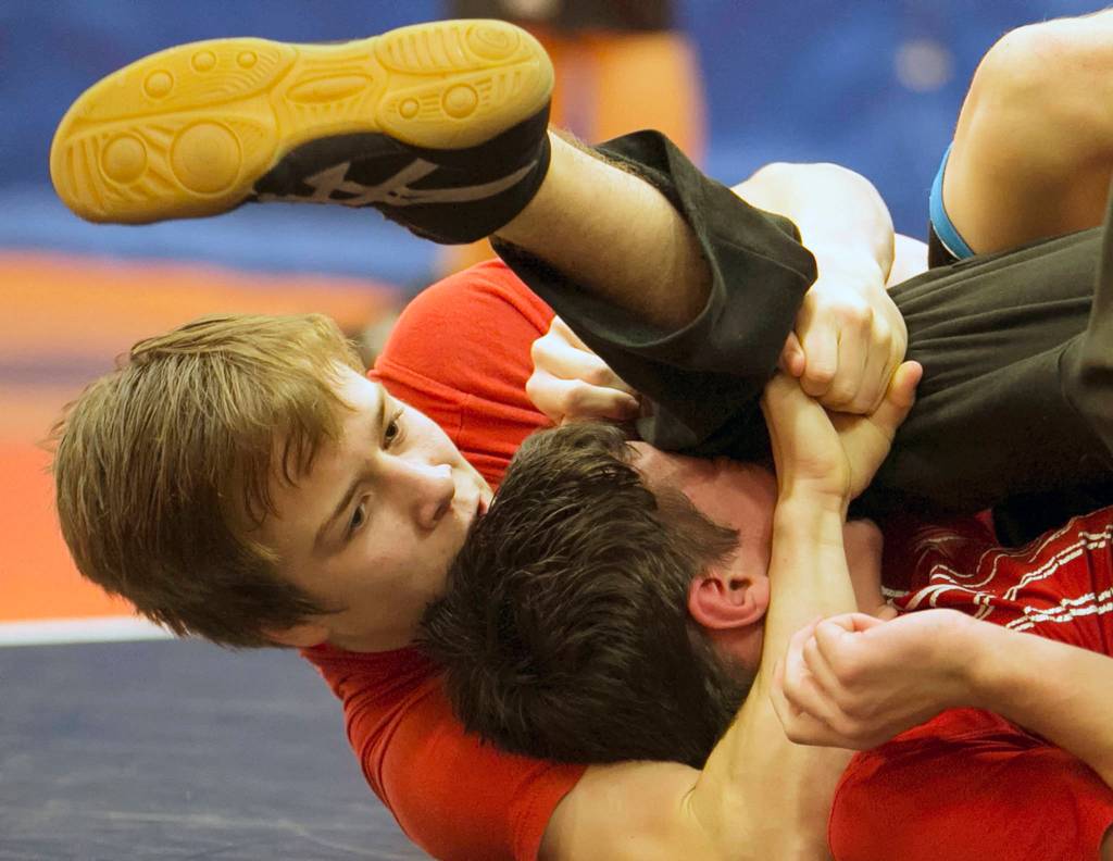 Chad Pease locks Josh Maggard during practice at Sky Valley Education Center in Monroe on Jan. 17. (Kevin Clark / The Herald)