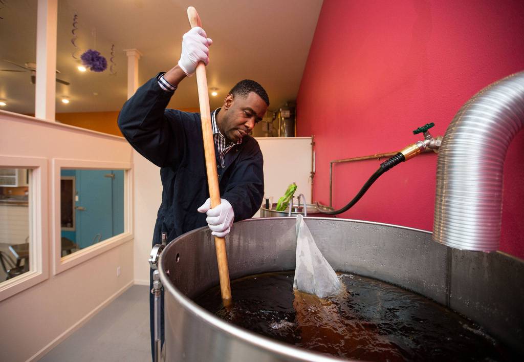 Lowell Profit, co-owner of the new GloryBucha kombucha bar in Arlington, stirs sugar in a vat of kombucha. The drink is a carbonated fermented tea. (Andy Bronson / The Herald)