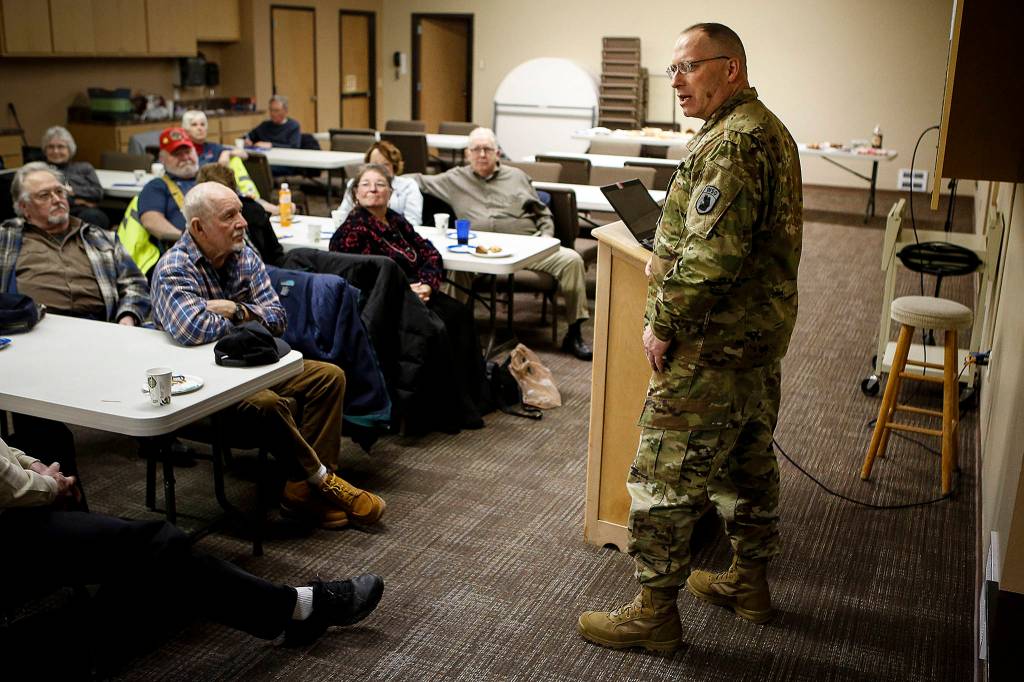 Washington State Guard Capt. and Chaplain Vance Whippo speaks to HIS veterans, a ministry at Camano Chapel, on Thursday. (Ian Terry / The Herald)