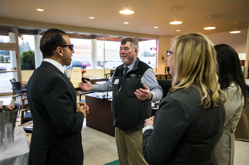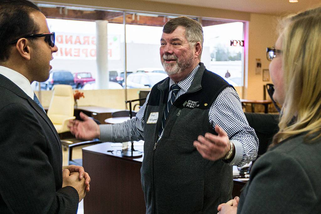 Owner Brian Hollingshead (center) with Lt. Gov. Cyrus Habib (left) and other well-wishers at the Jan. 25 grand opening of Everett Office Furniture, four months after the store burned down. The business was able to get up and running four days after the fire because all the crucial paperwork inside the safe survived. (Andy Bronson / The Herald)