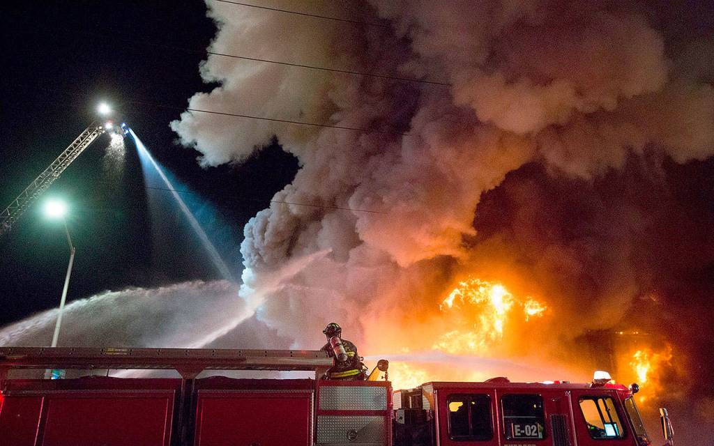Firefighters pour water on a three-alarm fire at Everett Office Furniture on Broadway on Sept. 25, 2017, in Everett. The fire caused damage estimated at $1.5 million. (Andy Bronson / Herald file)