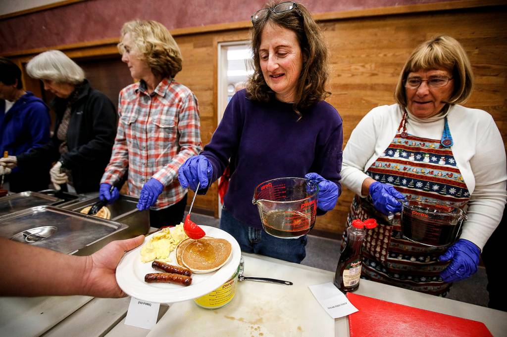 Volunteers spend one Saturday each month serving the Neighbors in Need breakfast at Trinity Lutheran in Lynnwood. Other volunteer groups work with students at Chase Lake and Cedar Valley community schools.