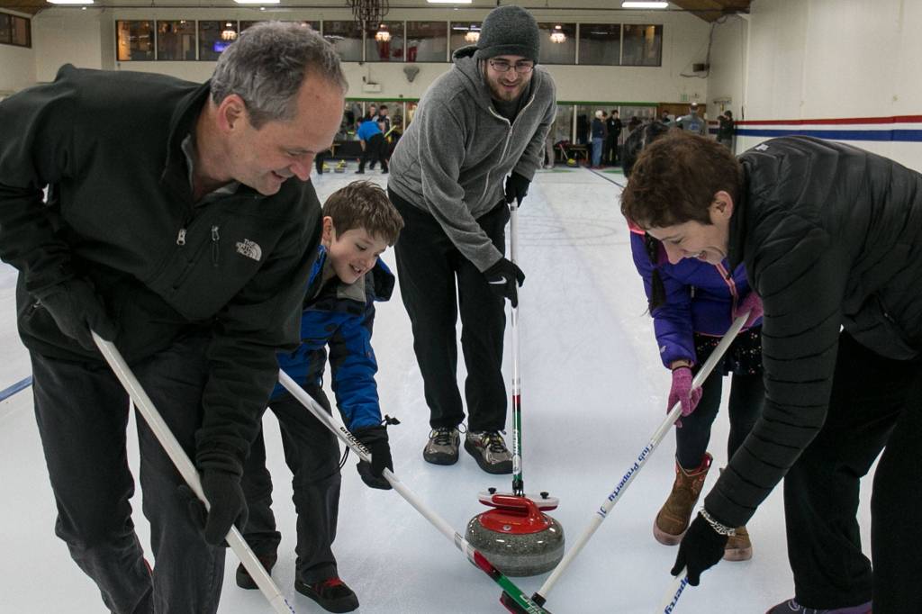 A pair of families, the Kerwins and Normans, signed up together to expand their horizons. The informal open house format is friendly for kids of all ages. Kurt and Jelena Norman and their children Lars, 7, and Sole, 11, and Bill and Kim Kerwin, and their kids Quinn, 14, and Ruby, 11, all picked up the game quickly, laughing and joking with one another throughout the two hours. Sweeping, a major part of curling, was even done with smiles on the kids’ faces.