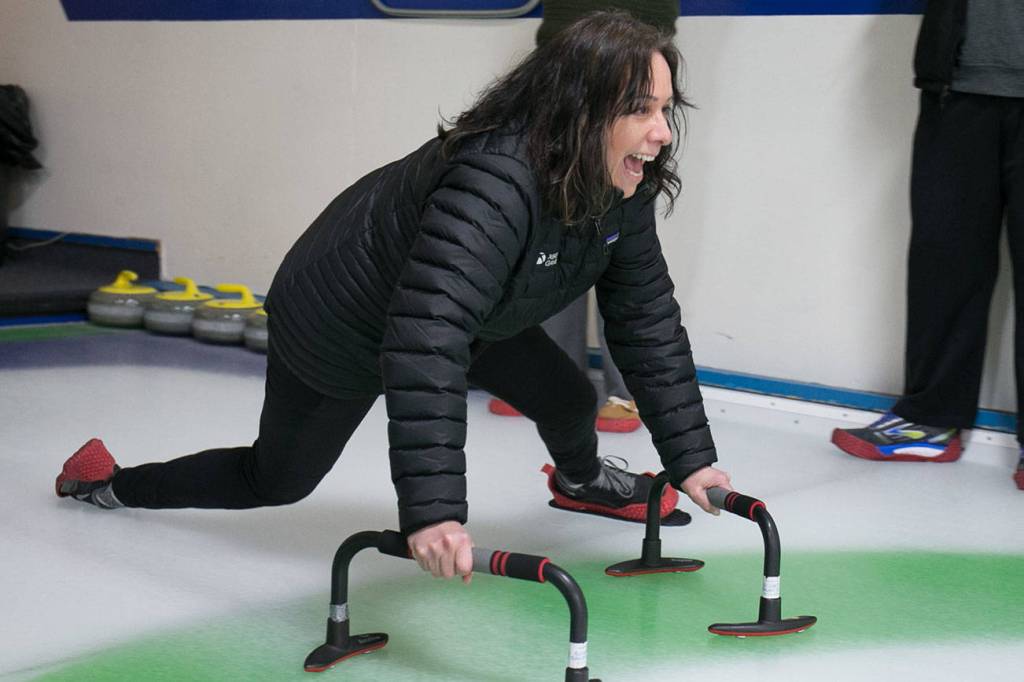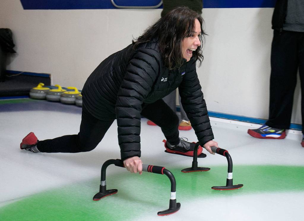 Open houses act as a gateway for those interested in the game. Curling veterans take groups of eight, spread them out on the traditional long sheet of ice and start breaking down the basics. Place your dominant foot in the hack, or a small rubber backstop, push off and get your knee under you as your other foot glides over the ice under a swatch of teflon. It’s like doing lunges on a bed of ball bearings.