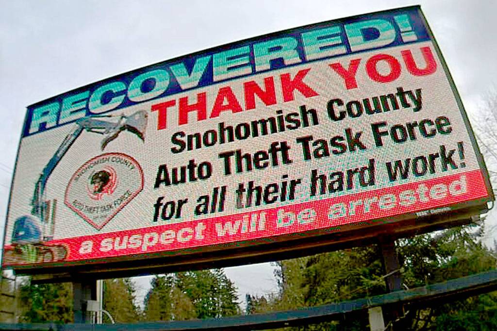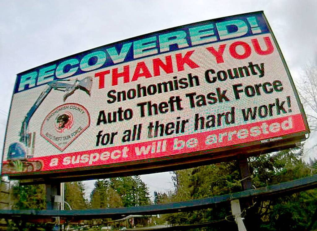 Later, Sourbeer used two billboards — one off the Snohomish-Woodinville Road near Costco; the other off Airport Road across from The Home Depot — to acknowledge the Snohomish County Auto Theft Task Force for tracking the excavator down.