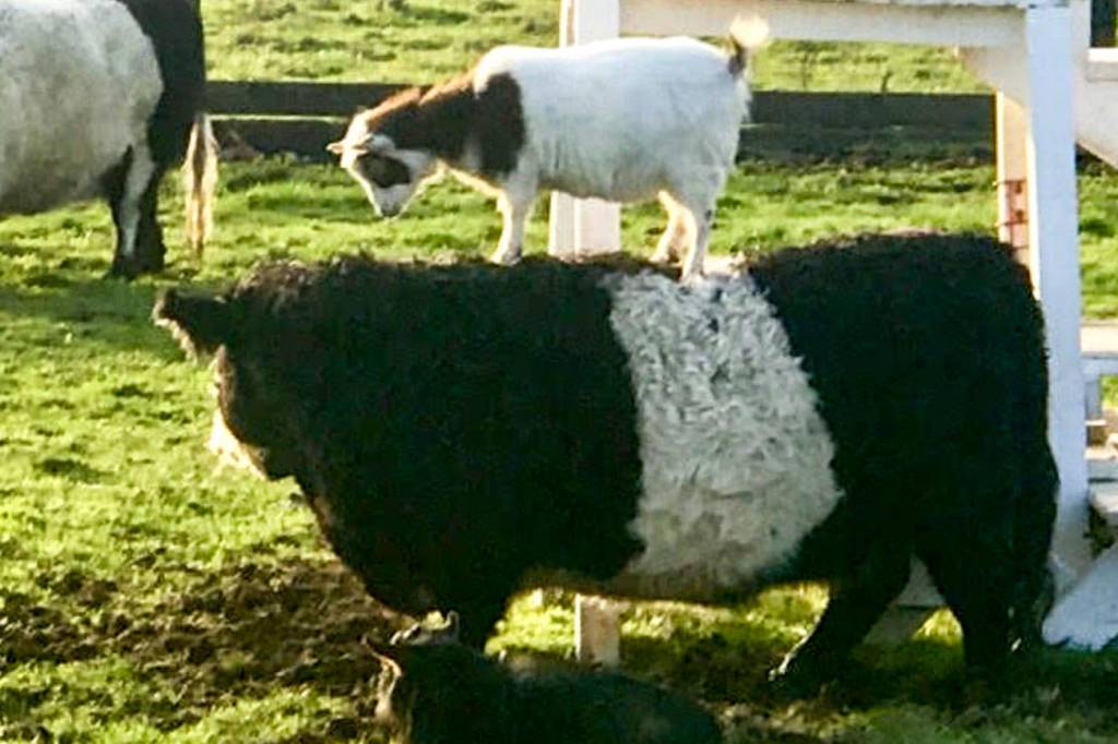 The sender, Randy De Jong, included a photo of his goat doing a balancing act on the back of a petite cow with markings that resemble a giant panda.