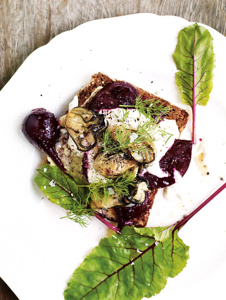 Toast the rye bread, allow to cool slightly, then spread generously with butter. Place one slice of toast on each plate, divide the beets equally between them, and spoon over the creme fraiche. Remove the warm smoked oysters from their shells and place them on top. Finish each plate with a scattering of more dill, and serve. Makes 2 servings.