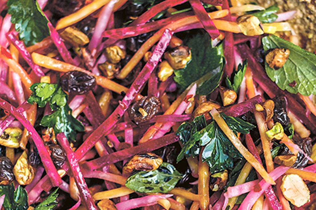 Beet slaw with pistachios and raisins