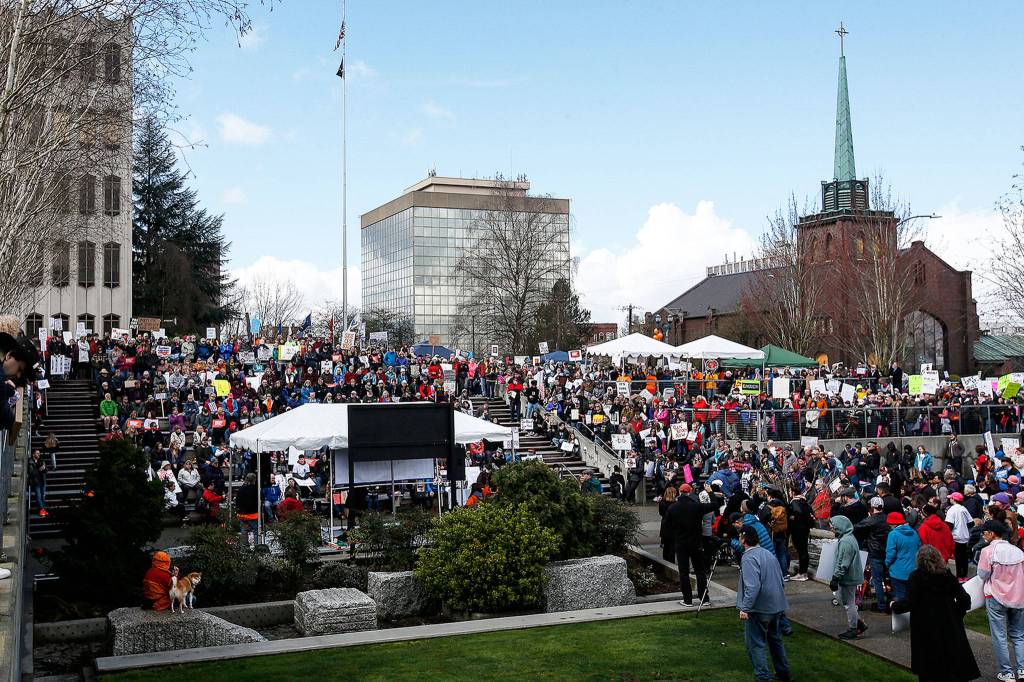 It was the largest political gathering in downtown Everett since August 2016, when then-candidate Donald Trump held a campaign rally that filled what’s now known as Angel of the Winds Arena to capacity, with more people spilling outside.