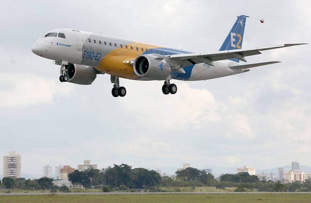 The first flight of the Embraer E190-E2, which enters service next week. (Embraer)