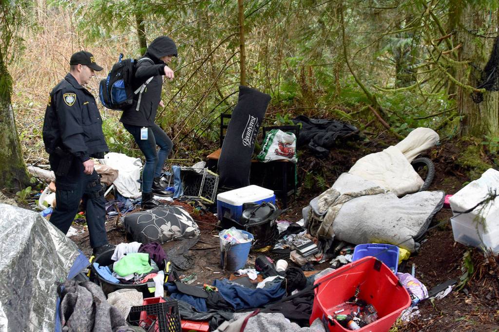 On Thursday morning Marysville officer Mike Buell stepped over dirty pillows, discarded pink underwear and scattered drug needles on the muddy, rain-soaked trails in the woods north of 172nd Street NE. Behind him hiked Arlington police officer Ken Thomas and the embedded social workers — Rochelle Long, of Marysville, and Britney Sutton, of Arlington — who carried backpacks heavy with supplies.