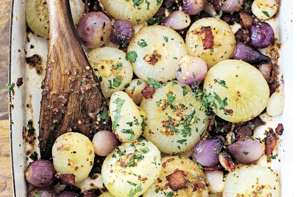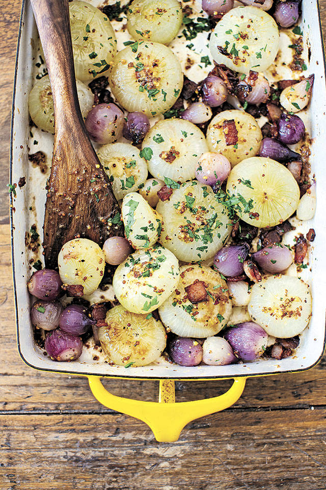 Meanwhile, fry the bacon in a small skillet over moderately high heat, stirring from time to time, until crisp, about 8 minutes. Using a slotted spoon, scoop out the bacon and transfer to a paper towel-lined plate to drain. Keep any fat that remains in the skillet. Return the skillet to the heat and add the vinegar, mustard, sugar and ¼ teaspoon salt, stirring to dissolve the sugar. Pour the hot dressing over the roasted onions, along with the crisped bacon. Toss everything gently together, garnish with the parsley and serve warm. Serves 6.