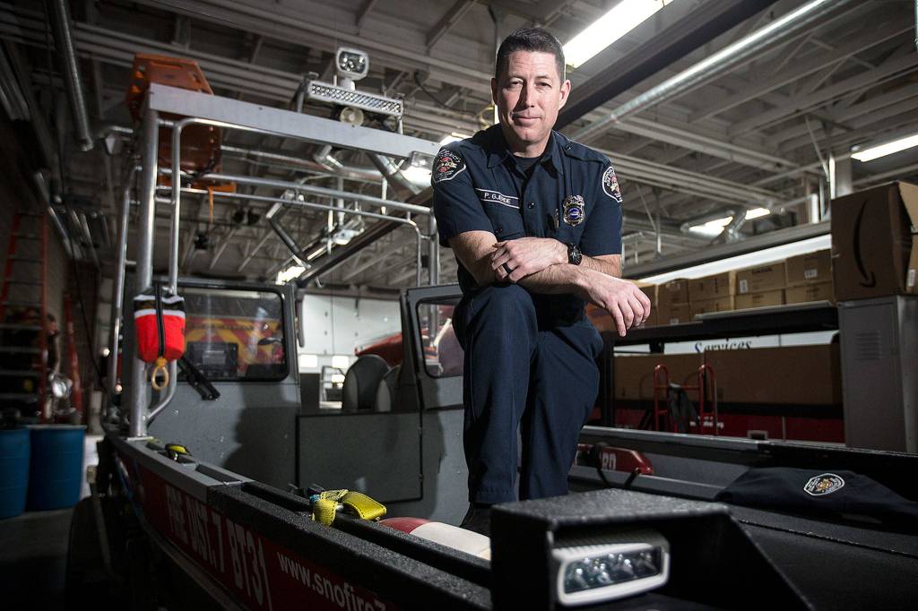 Pat Gjerde, a Monroe firefighter, stands on a rescue boat used for water rescue operations at the Monroe Fire Department. (Ian Terry / The Herald)