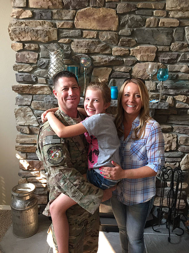 Pat Gjerde (left) and Janet Gjerde with their daughter, just half an hour after he returned home from Afghanistan. (Family photo)