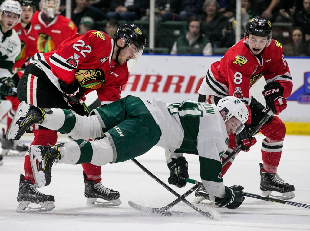 Everett’s Garret Pilon is boxed in by Portland’s Kieffer Bellows (left) and Portland’s Cody Glass at Angel of the Winds Arena on April 6. (Kevin Clark / The Herald)