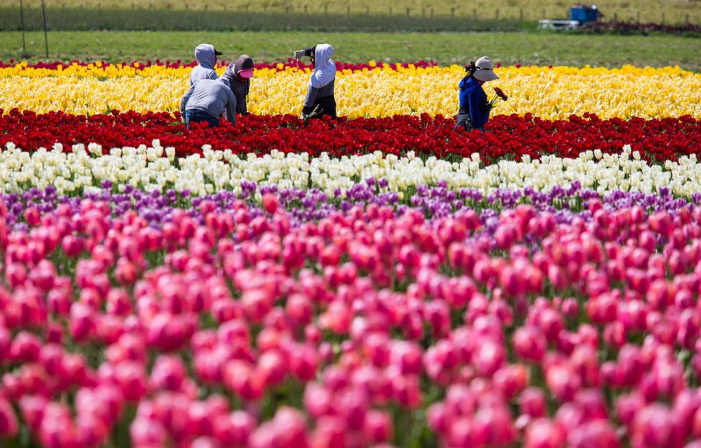 The display gardens are delightful. Visit Washington Bulb Co.’s RoozenGaarde, run by the Roozen family, at 15867 Beaver Marsh Road, www.tulips.com; and Skagit Valley Bulb Farm’s Tulip Town, run by the DeGoede family, 15002 Bradshaw Road, www.tuliptown.com. These gardens offer a look at the blooms of dozens of bulb varieties, have activities for kids, gifts, treats and, of course, cut flowers. General admission at both places is $7, but parking is free. RoozenGaarde admission tickets are good for free parking at fields around the valley marked with the RoozenGaarde sign.