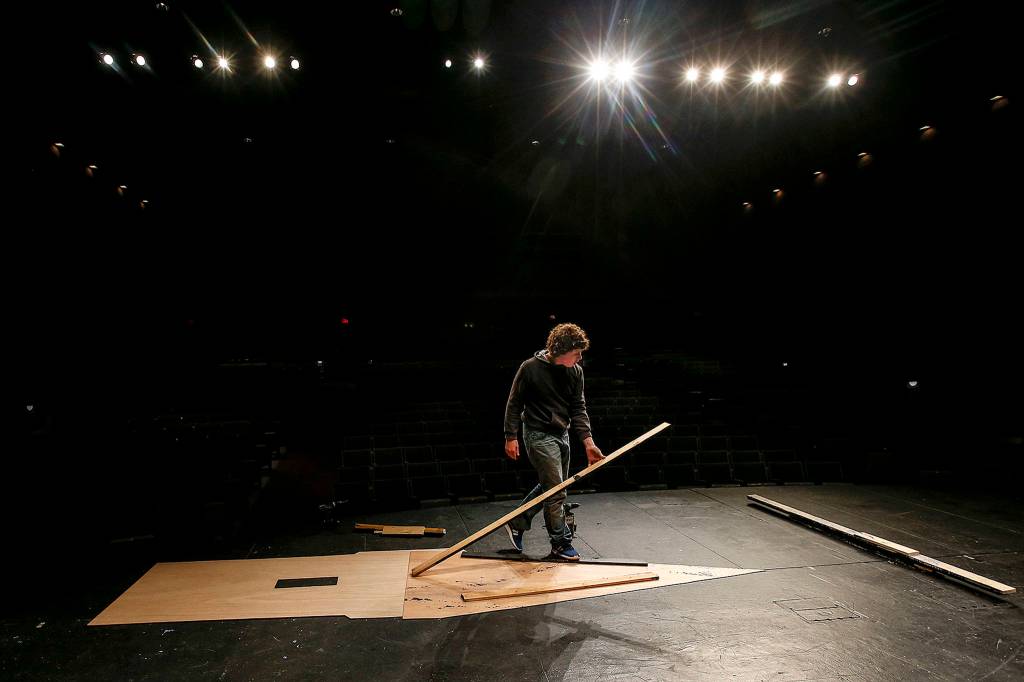 The framework for a castle tower is laid out by a student preparing props for Kamiak High School’s production of “Spamalot” on April 4. (Ian Terry / The Herald)