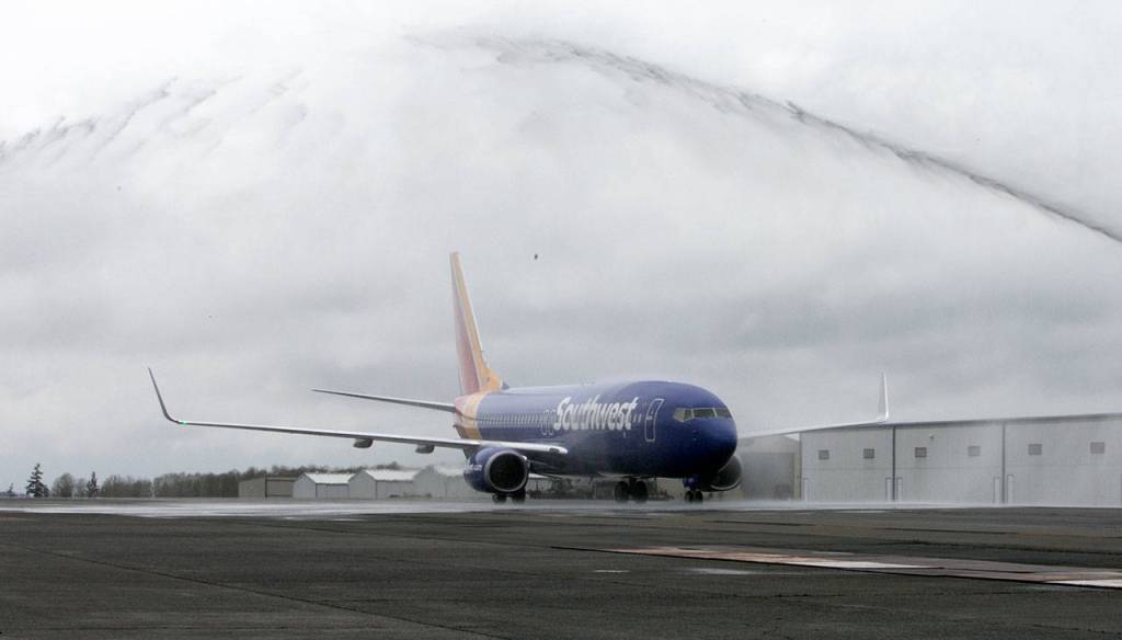 EVERETT — As Bill Rogers’ last flight for Southwest Airlines began descending at Paine Field Friday two fire trucks were lined up at the airfield, watching closely as the plane emerged from the low hanging clouds. But no emergency was expected. Instead, they were there to greet Rogers with a traditional water cannon salute to honor his three-decade career at Southwest.