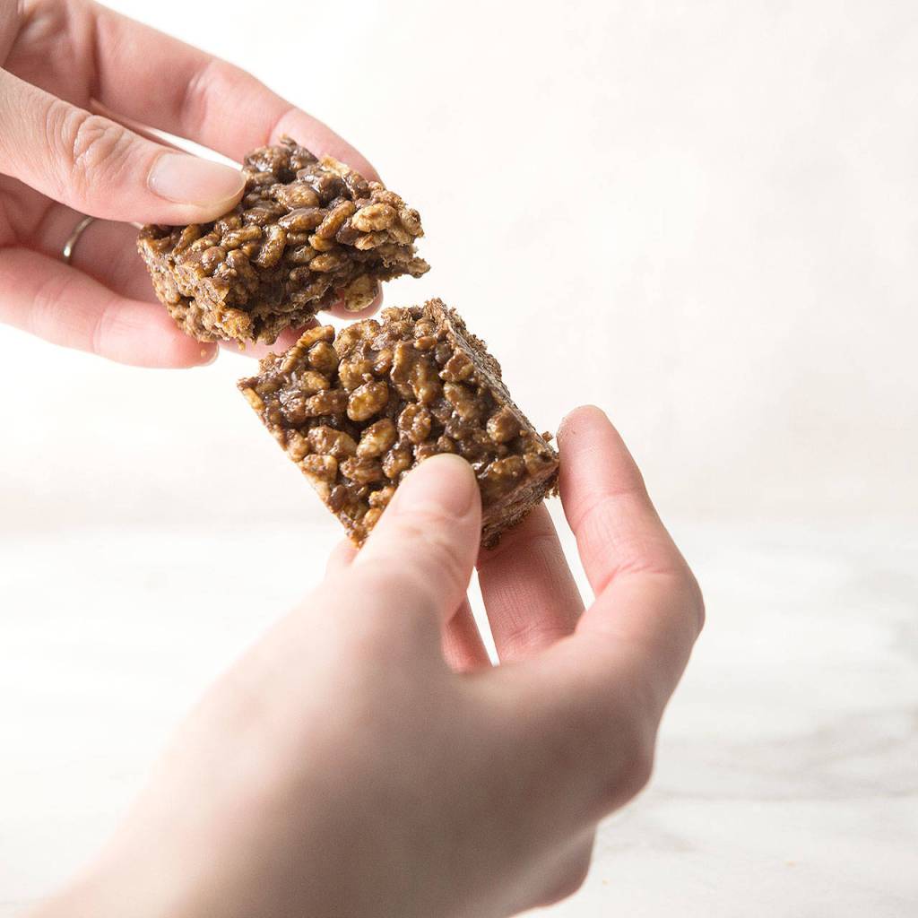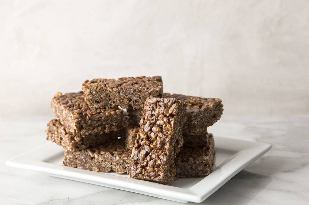 Like the childhood favorite, these are homey squares of crispy rice cereal held together with sweet gooeyness. But here the sticky, rich coating doesn’t come from melted marshmallows and butter. It is from a better-for-you and more deeply flavorful yet comfortably familiar blend of honey and peanut butter. Plus, these are made with whole-grain, rather than refined, rice cereal.