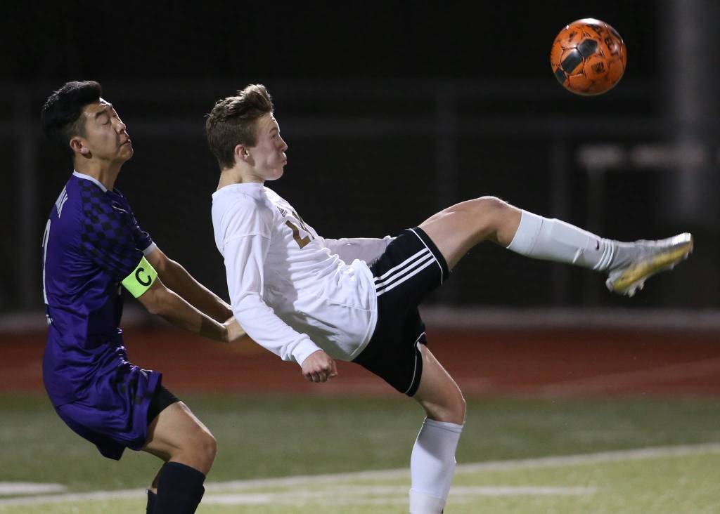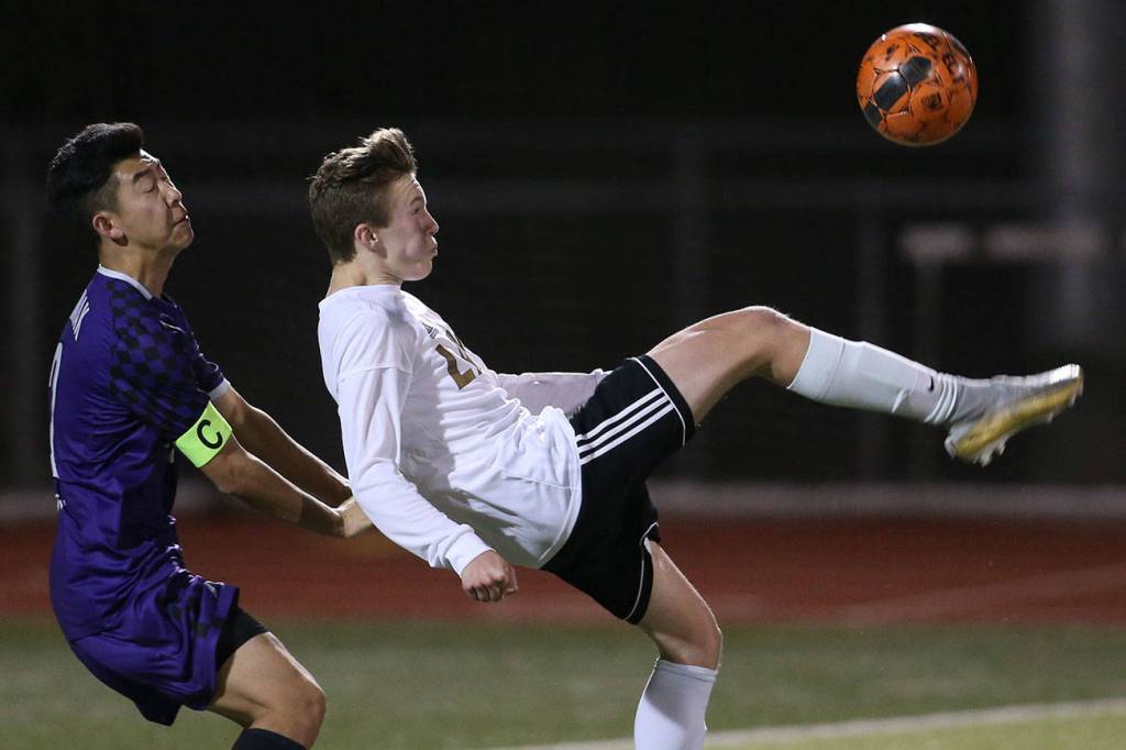 Lake Stevens’ Jackson Busby kicks the ball back over the head of Kamiak’s Joshua Pang on Tuesday, April 24, 2018 in Lake Stevens, Wa. (Andy Bronson / The Herald)
