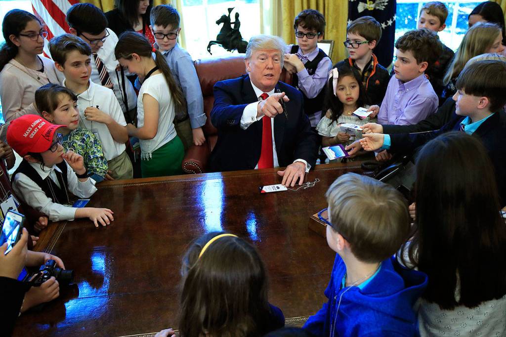 Trump autographed caps and commemorative passes worn by the children before taking them into the Oval Office. He had asked the kids whether they wanted their parents in or out of the Oval Office. “Out!” they exclaimed in unison, and so the grown-ups were left to huddle around and peep through the few available windows.