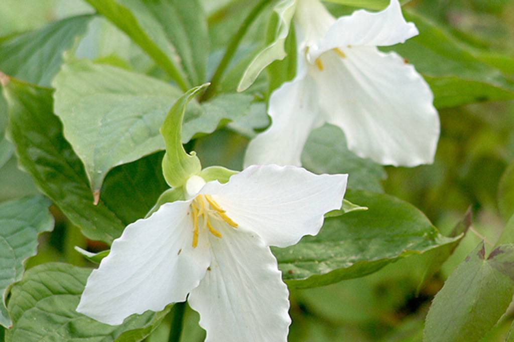 What: Trillium grandiflorum, commonly called great white trillium or white wakerobin, is a harbinger of spring in the eastern North American woodland, where it can be seen carpeting the forest floors. In early spring, succulent, bright green stems sprout from the soil and develop a canopy of three large, egg-shaped, almost stalkless leaves. In their center emerges a large, stalked, upward- or sideways-facing, pure white blossom. Each of its three petals have slightly ruffled edges. The enchantment and inspiration that this charming wildflower brings to the garden is unparalleled. A natural with other spring bloomers mix with primrose, pulmonarias or Omphalodes. The contrasting foliage of ferns will help set off the foliage.