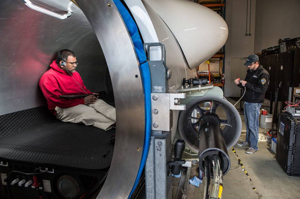 Titan is undergoing test trials in Puget Sound as an OceanGate crew tests its buoyancy, how fast it can move up and down, as well as other systems — sonar, cameras, lighting, laser scanners and more.