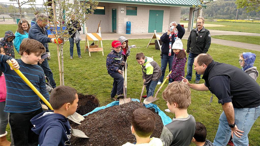 Third-graders from Fryelands Elementary School walked down the sidewalk April 27 to help Monroe Mayor Geoffrey Thomas and other city officials plant a red maple tree at Lake Tye Park for Arbor Day. This was the first such ceremony, and the city hopes to make it an annual event.