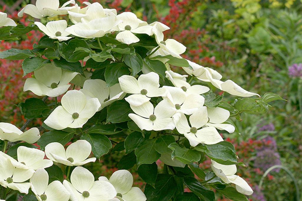 What: Cornus × elwinortonii, commonly called Venus dogwood. This newer dogwood boasts a profusion of large, creamy white flowers with a nubbin of green in the center. The flowers, or bracts, may be up to 6 inches across and stand out against the lustrous green foliage. In autumn the fruit are small red orbs, somewhat reminiscent of strawberries, and the leaves offer a palette of red, orange, and purple.