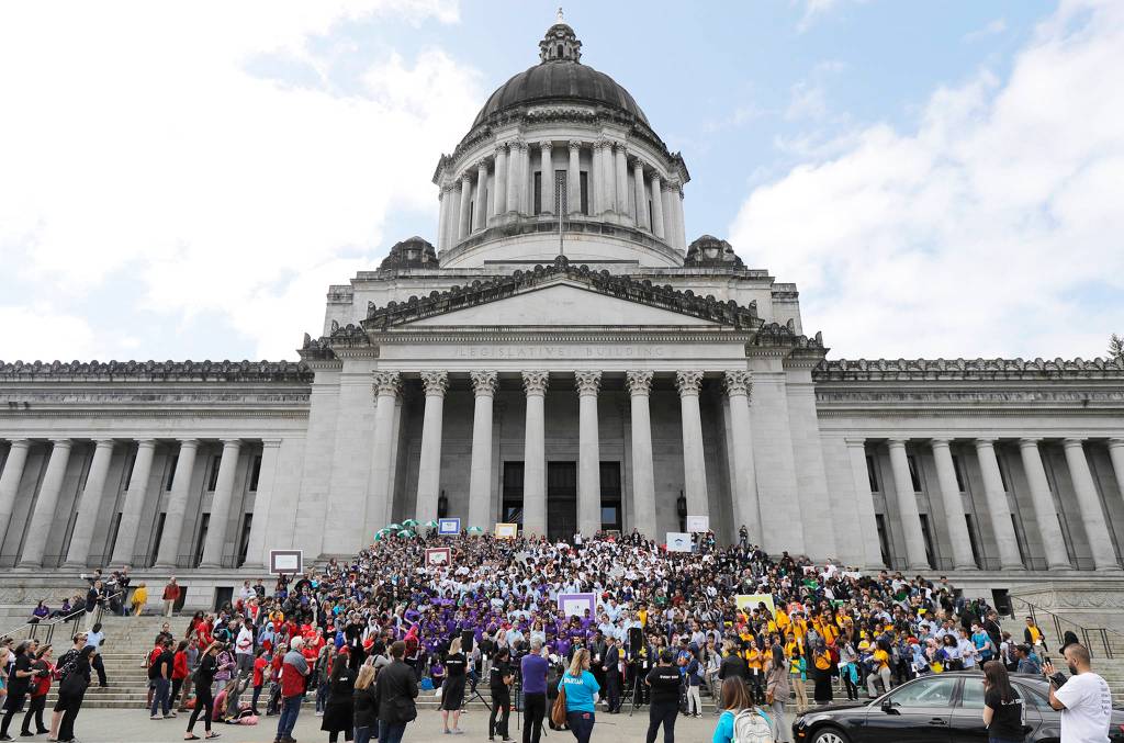 OLYMPIA — Hundreds of charter school students rallied at the state Capitol on Thursday as the Washington Supreme Court considered arguments that could threaten to close their classrooms.