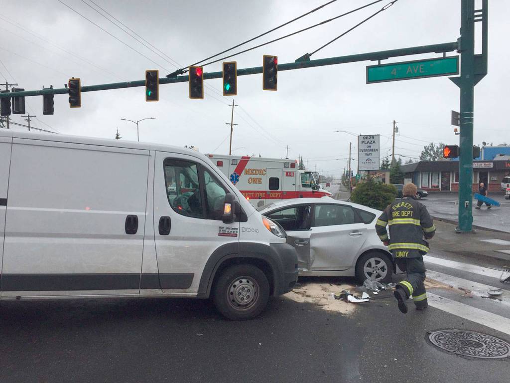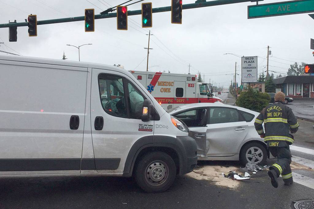 The Everett Police Department reported the collision around 9 a.m. at the intersection of Fourth Avenue West and Evergreen Way. Everett Police officer Aaron Snell said it appeared the driver of a Toyota Prius ran through a non-functioning stoplight and collided with a small van. The Prius driver was taken to Providence Regional Medical Center Everett with non-life-threatening injuries, Snell said.