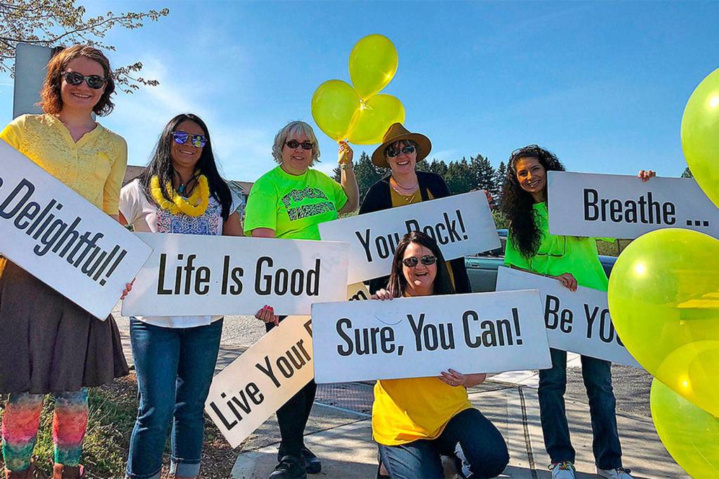 Lisa Mills, of Mill Creek, celebrated her birthday on May 2 by organizing a Happiness Sprinkling group. Friends Breaonna Brask, Toni Wilson, Laura Peterson, Kim Kuhne and Lona Brask joined in. The group of yellow-clad women stood at the corner of 35th Avenue SE and 132nd Street SE and held up signs with messages like “You Are Delightful!” and “You Rock!”