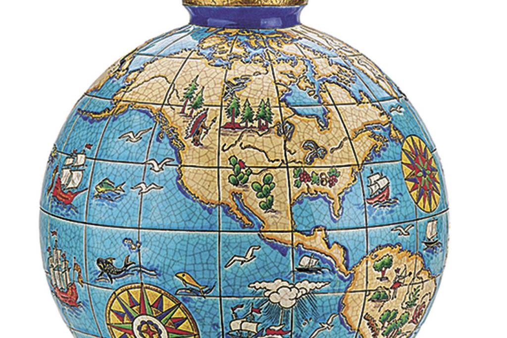 A Rago auction in New Jersey sold a 12-inch Longwy vase shaped and decorated like a globe last year. It was made by Maurice-Paul Chevallier (1892-1987), the director of the French company after 1930. The vase is named Atlas. The countries are not marked on the globe — just the land masses and oceans — so it will always be current. It sold for $4,063.
