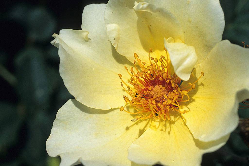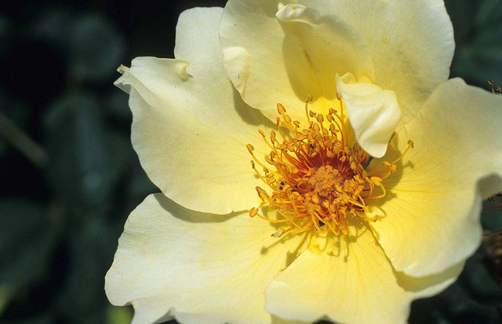 What: Rosa “Golden Wings” is a photographer’s dream, due to its large, clear, almost single, pale golden flowers with marmalade stamens, as rosarian Christine Allen likes to describe them. The flowers seem set to take flight from the matte, light-green leaves. They develop from long, pointed buds and are borne singly or in clusters. Sweetly scented, the flowers of “Golden Wings” appear from June until October, and can be used in arrangements. In autumn, “Golden Wings” produces apple-green hips. The hybrid rose was introduced by Roy Shepherd in 1956.