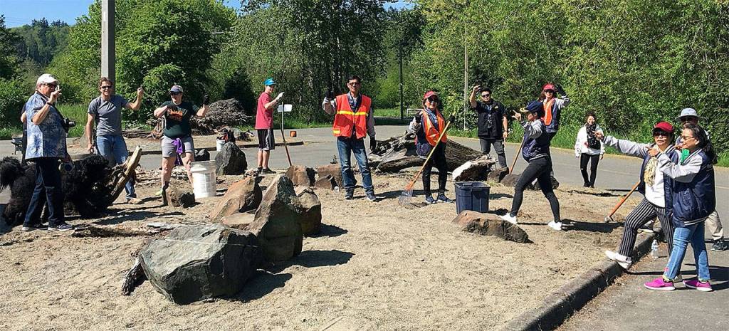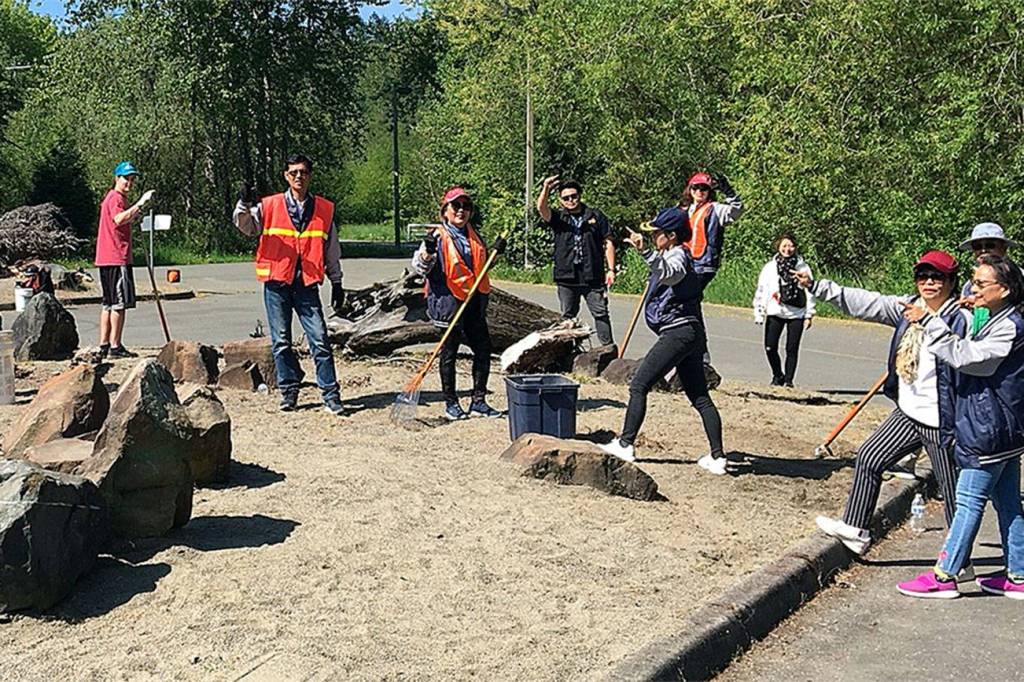 A group of more than 50 Rotary Club volunteers, including nine Rotary members visiting from Thailand, turned out May 5 for an annual cleanup of Rotary Park in Everett’s Lowell neighborhood.
