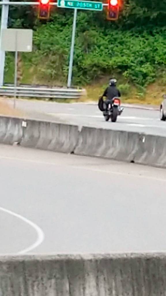 The driver of the bike picked up the motorcycle, climbed back on and sped off east on Highway 104, the main route from Edmonds to Lake Forest Park.