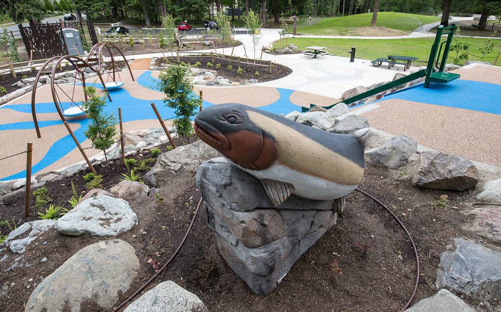 The playground on the west side of Lake Stickney is one of two new parks in unincorporated Snohomish County that attempt to blend man-made structures with the natural surroundings. Felled logs surround the play area with swings and a slide, plus views of woods and wetlands.